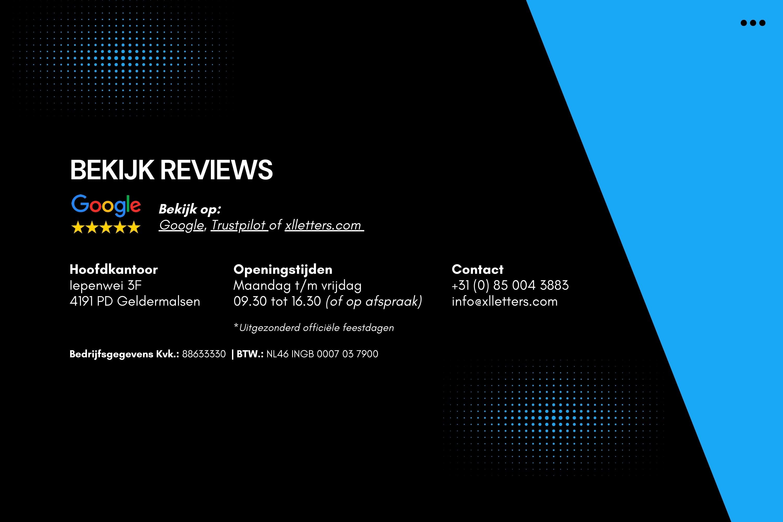 Bestel de direct de lichtletters van xlletters.com online. Met 100% beschikbaarheid hebben we op elk gewenst moment de gewenste letters, cijfers of symbolen. Kies uit warm witte LEDs of Kleuren LEDs en de één van de volgende bezorgopties: bezorgd per PostNL - Halen & Brengen op afspraak - Zelf ophalen & retourneren in Geldermalsen | Combineren in de bezorgopties is geen enkel probleem.